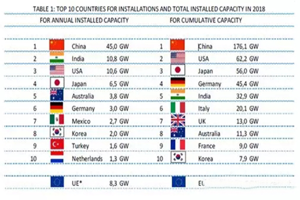 近年來,中國光伏市場的發展水平在很大程度上推動了全球光伏市場的發展。然而,盡管中國光伏市場在2017年之前一直在增長,但在2018年經歷了小幅的下滑。然而,中國光伏市場的這種下滑,并未對全球光伏市場產生較大影響,相反全球光伏市場得到了中國以外地區更大裝機容量的補償。2018年中國新增光伏裝機容量約為45GW,而2017年的新增為53 GW。全球光伏市場呈現穩定態勢,2018年新增裝機容量為99.8 GW,而2017年新增為98.9 GW。