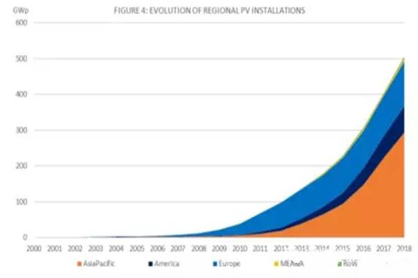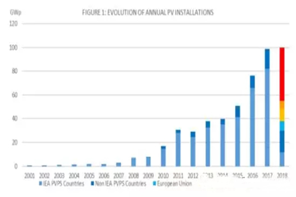 總體而言,全球光伏市場幾乎達到了1億千瓦的大關。如果中國的市場水平與此類似,那么這一增幅將遠遠高于2017年的安裝水平。2018年,中國境外市場的增長超過17%,而2017年為15%。